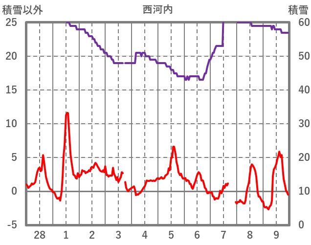 | 日 | 時 | 気温 | 降水 | 風向/風速 | 日照 | 積雪 | 降雪 |
