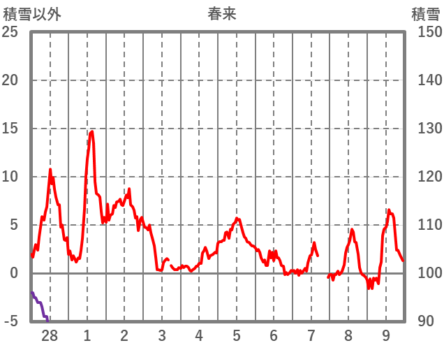 | 日 | 時 | 気温 | 降水 | 風向/風速 | 日照 | 積雪 | 降雪 |