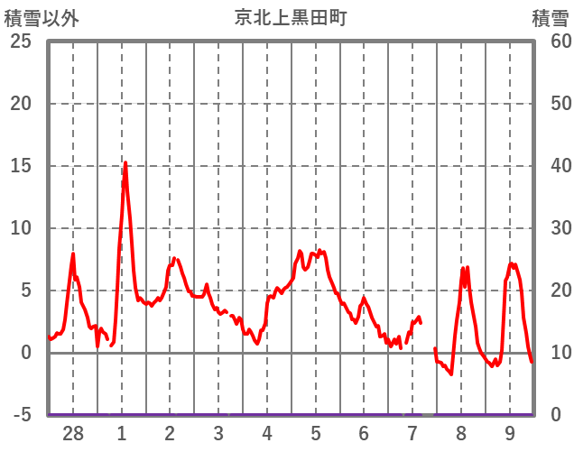 | 日 | 時 | 気温 | 降水 | 風向/風速 | 日照 | 積雪 | 降雪 |