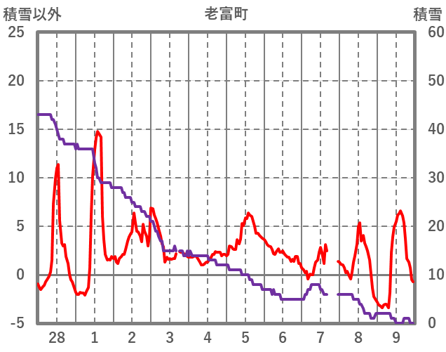 | 日 | 時 | 気温 | 降水 | 風向/風速 | 日照 | 積雪 | 降雪 |