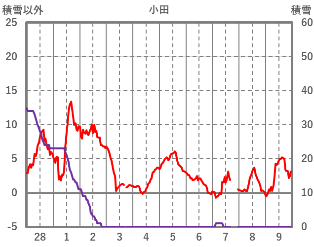 | 日 | 時 | 気温 | 降水 | 風向/風速 | 日照 | 積雪 | 降雪 |