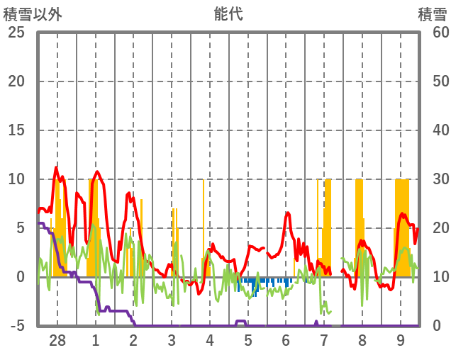 | 日 | 時 | 気温 | 降水 | 風向/風速 | 日照 | 積雪 | 降雪 |