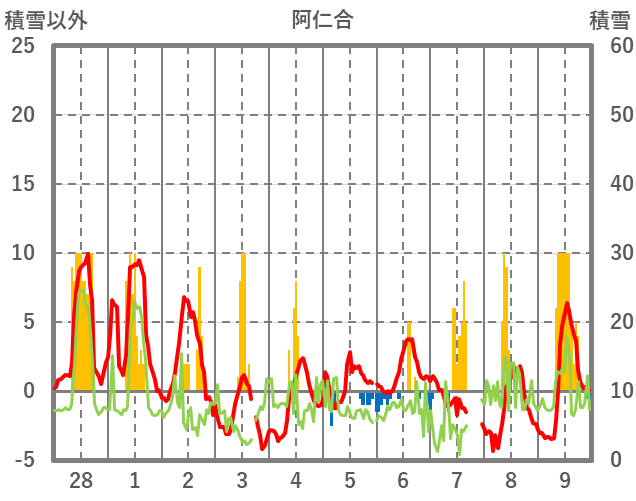 | 日 | 時 | 気温 | 降水 | 風向/風速 | 日照 | 積雪 | 降雪 |