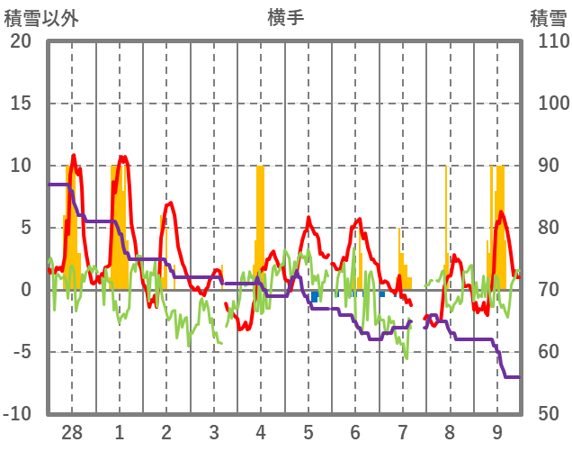 | 日 | 時 | 気温 | 降水 | 風向/風速 | 日照 | 積雪 | 降雪 |