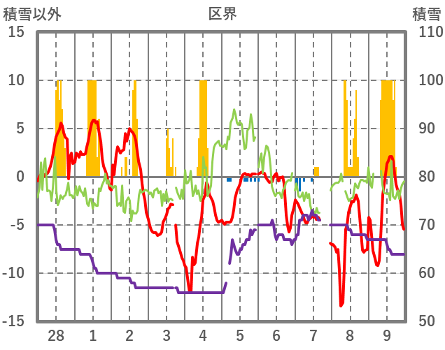 | 日 | 時 | 気温 | 降水 | 風向/風速 | 日照 | 積雪 | 降雪 |