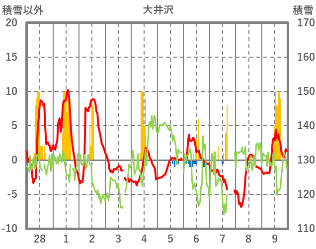 | 日 | 時 | 気温 | 降水 | 風向/風速 | 日照 | 積雪 | 降雪 |