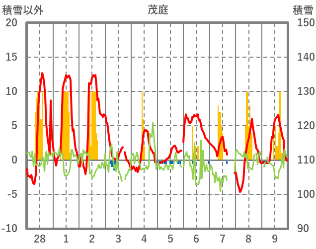 | 日 | 時 | 気温 | 降水 | 風向/風速 | 日照 | 積雪 | 降雪 |