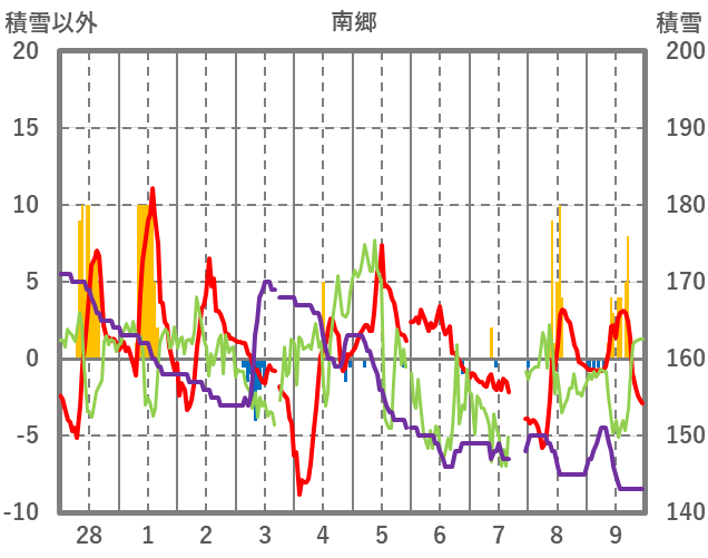 | 日 | 時 | 気温 | 降水 | 風向/風速 | 日照 | 積雪 | 降雪 |