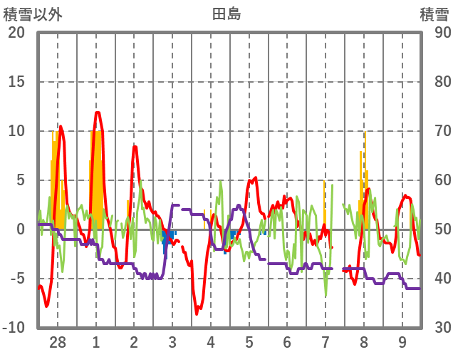 | 日 | 時 | 気温 | 降水 | 風向/風速 | 日照 | 積雪 | 降雪 |