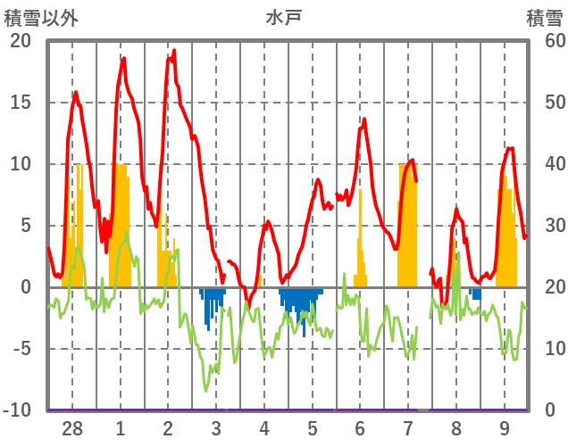 | 日 | 時 | 気温 | 降水 | 風向/風速 | 日照 | 積雪 | 降雪 |