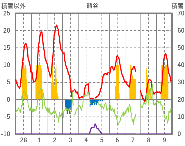 | 日 | 時 | 気温 | 降水 | 風向/風速 | 日照 | 積雪 | 降雪 |