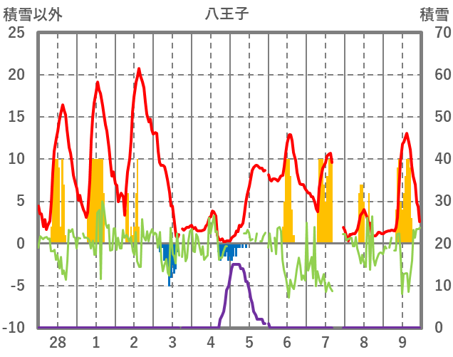 | 日 | 時 | 気温 | 降水 | 風向/風速 | 日照 | 積雪 | 降雪 |