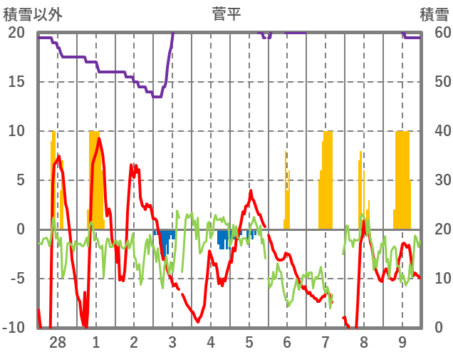 | 日 | 時 | 気温 | 降水 | 風向/風速 | 日照 | 積雪 | 降雪 |