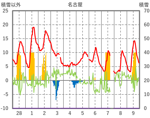 | 日 | 時 | 気温 | 降水 | 風向/風速 | 日照 | 積雪 | 降雪 |