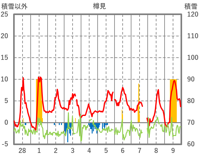 | 日 | 時 | 気温 | 降水 | 風向/風速 | 日照 | 積雪 | 降雪 |