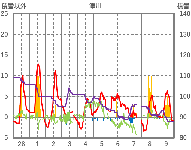 | 日 | 時 | 気温 | 降水 | 風向/風速 | 日照 | 積雪 | 降雪 |