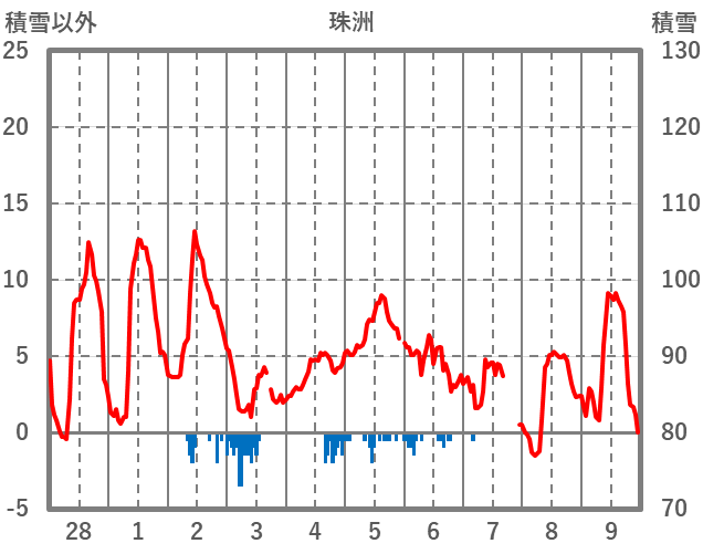 | 日 | 時 | 気温 | 降水 | 風向/風速 | 日照 | 積雪 | 降雪 |