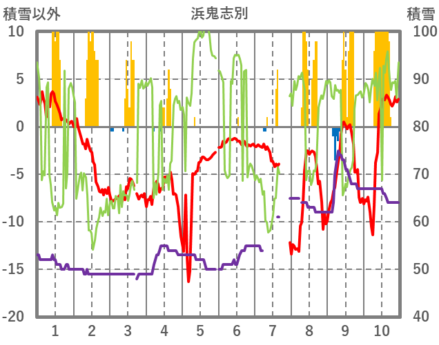 | 日 | 時 | 気温 | 降水 | 風向/風速 | 日照 | 積雪 | 降雪 |