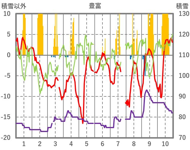 | 日 | 時 | 気温 | 降水 | 風向/風速 | 日照 | 積雪 | 降雪 |