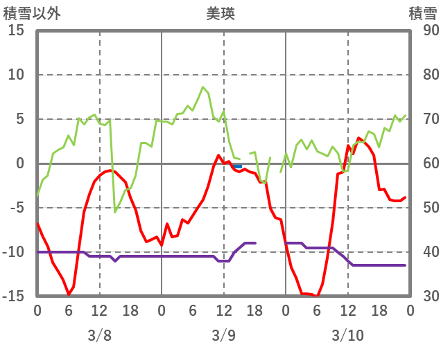 | 日 | 時 | 気温 | 降水 | 風向/風速 | 日照 | 積雪 | 降雪 |