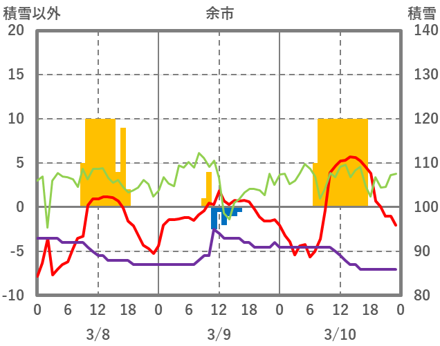 | 日 | 時 | 気温 | 降水 | 風向/風速 | 日照 | 積雪 | 降雪 |