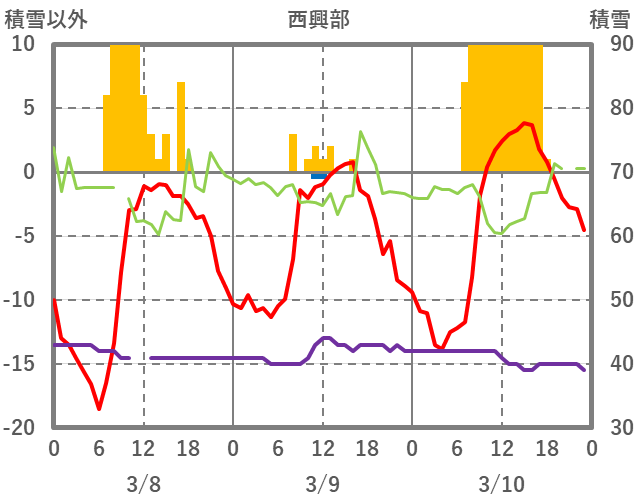 | 日 | 時 | 気温 | 降水 | 風向/風速 | 日照 | 積雪 | 降雪 |