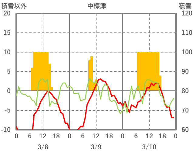 | 日 | 時 | 気温 | 降水 | 風向/風速 | 日照 | 積雪 | 降雪 |