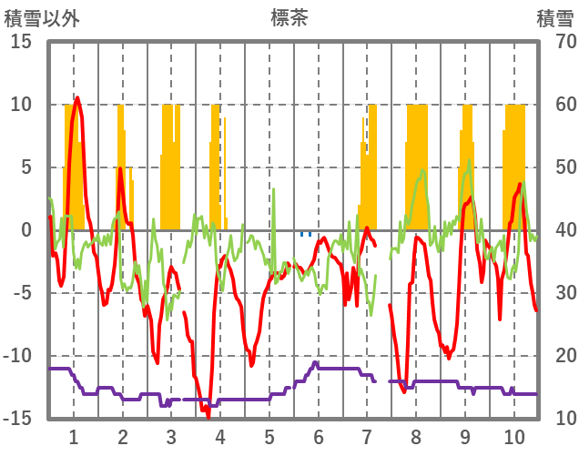 | 日 | 時 | 気温 | 降水 | 風向/風速 | 日照 | 積雪 | 降雪 |