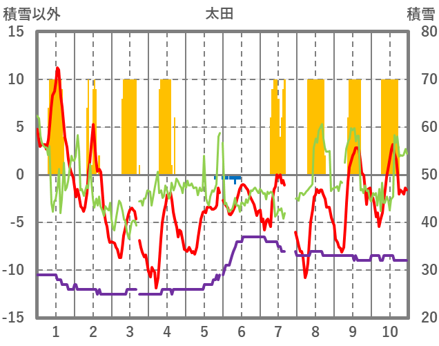 | 日 | 時 | 気温 | 降水 | 風向/風速 | 日照 | 積雪 | 降雪 |