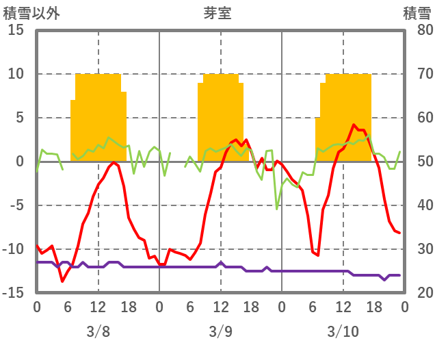 | 日 | 時 | 気温 | 降水 | 風向/風速 | 日照 | 積雪 | 降雪 |
