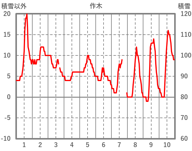| 日 | 時 | 気温 | 降水 | 風向/風速 | 日照 | 積雪 | 降雪 |