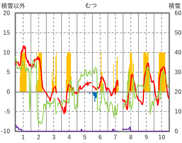 | 日 | 時 | 気温 | 降水 | 風向/風速 | 日照 | 積雪 | 降雪 |