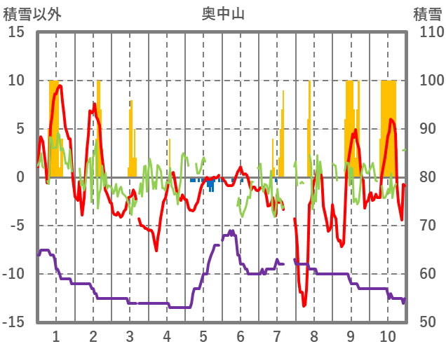 | 日 | 時 | 気温 | 降水 | 風向/風速 | 日照 | 積雪 | 降雪 |