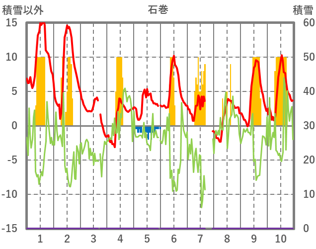 | 日 | 時 | 気温 | 降水 | 風向/風速 | 日照 | 積雪 | 降雪 |
