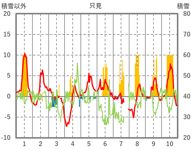 | 日 | 時 | 気温 | 降水 | 風向/風速 | 日照 | 積雪 | 降雪 |