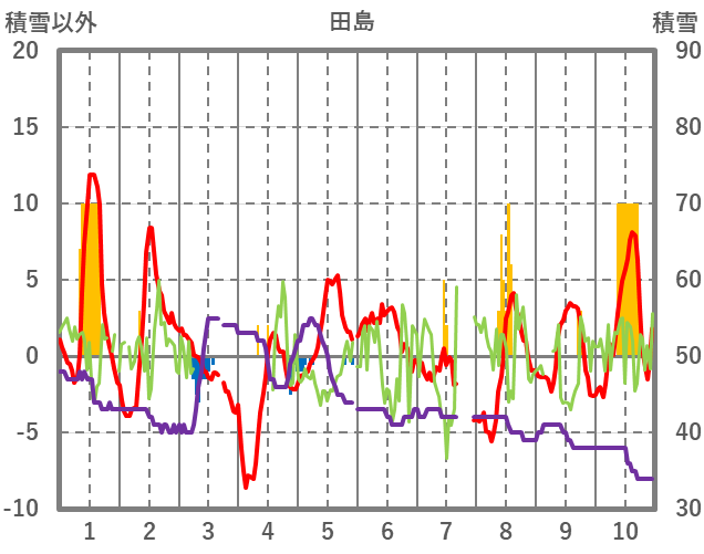 | 日 | 時 | 気温 | 降水 | 風向/風速 | 日照 | 積雪 | 降雪 |