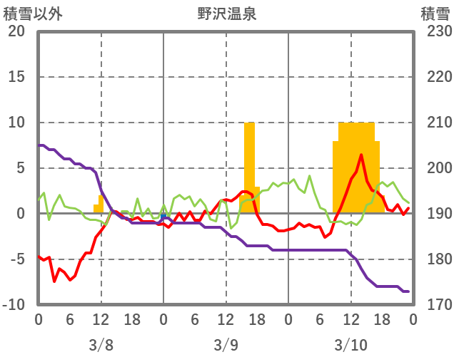 | 日 | 時 | 気温 | 降水 | 風向/風速 | 日照 | 積雪 | 降雪 |