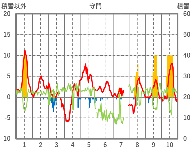 | 日 | 時 | 気温 | 降水 | 風向/風速 | 日照 | 積雪 | 降雪 |