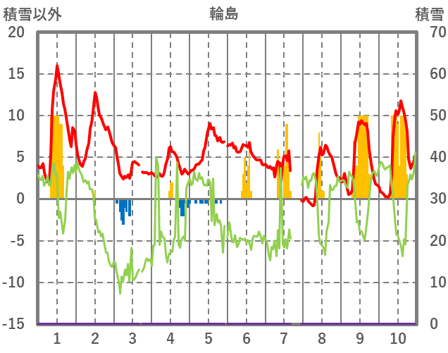 | 日 | 時 | 気温 | 降水 | 風向/風速 | 日照 | 積雪 | 降雪 |