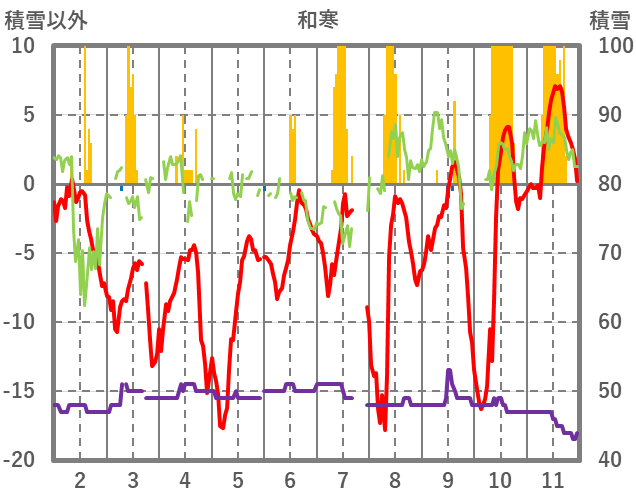 | 日 | 時 | 気温 | 降水 | 風向/風速 | 日照 | 積雪 | 降雪 |