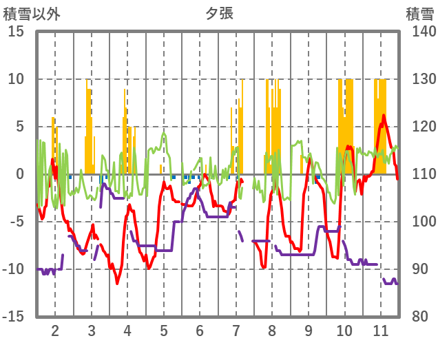 | 日 | 時 | 気温 | 降水 | 風向/風速 | 日照 | 積雪 | 降雪 |