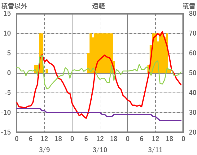 | 日 | 時 | 気温 | 降水 | 風向/風速 | 日照 | 積雪 | 降雪 |