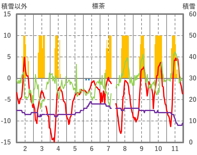 | 日 | 時 | 気温 | 降水 | 風向/風速 | 日照 | 積雪 | 降雪 |