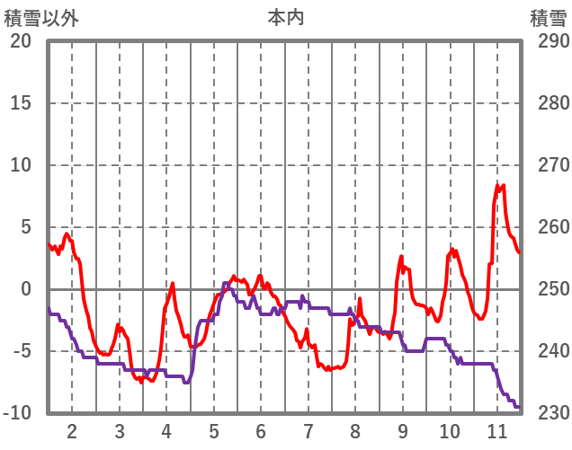 | 日 | 時 | 気温 | 降水 | 風向/風速 | 日照 | 積雪 | 降雪 |