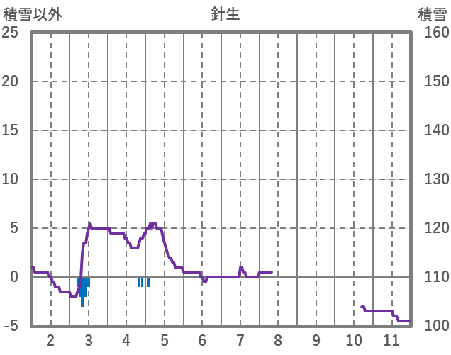| 日 | 時 | 気温 | 降水 | 風向/風速 | 日照 | 積雪 | 降雪 |