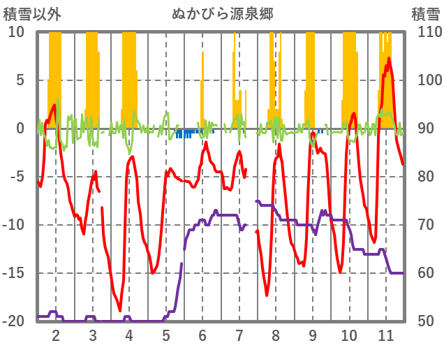 | 日 | 時 | 気温 | 降水 | 風向/風速 | 日照 | 積雪 | 降雪 |
