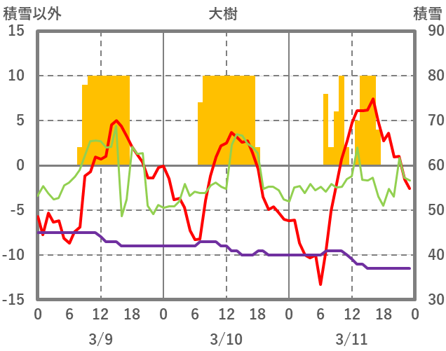 | 日 | 時 | 気温 | 降水 | 風向/風速 | 日照 | 積雪 | 降雪 |