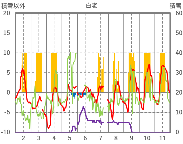 | 日 | 時 | 気温 | 降水 | 風向/風速 | 日照 | 積雪 | 降雪 |