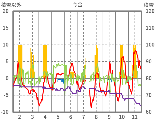 | 日 | 時 | 気温 | 降水 | 風向/風速 | 日照 | 積雪 | 降雪 |