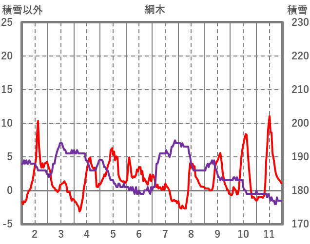 | 日 | 時 | 気温 | 降水 | 風向/風速 | 日照 | 積雪 | 降雪 |